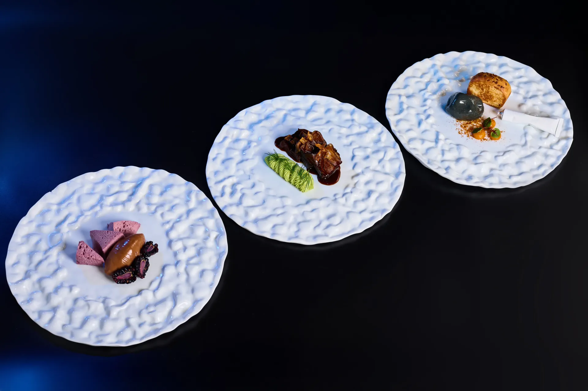 • Воздушное мороженое из черной смородины с шоколадным кремом и хвойной ежевикой.